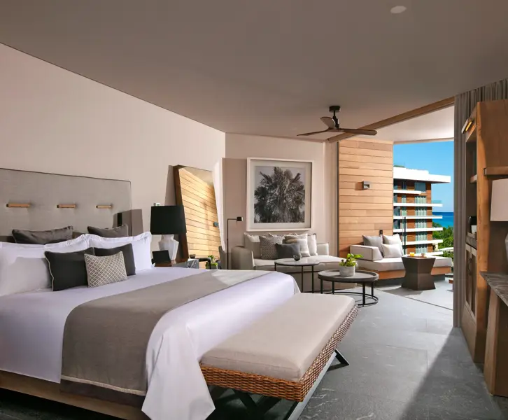 When you want to wind down, your Junior Suite Tropical View gives you a calm, modern space to settle into. There’s a rainfall shower, double vanities, a comfortable seating area, and a furnished balcony looking out over the greenery of the resort. The room keeps everything simple and easy, making it a welcoming place to end the day, especially after warm evenings out in Playa del Carmen or a long dinner around the resort.