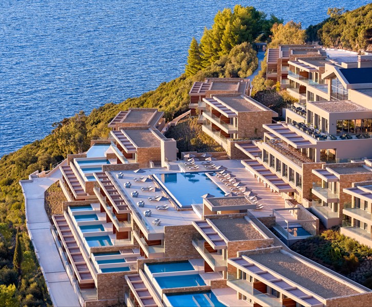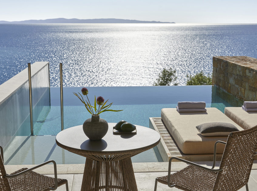 The hotel itself is built into the hillside above Karavostasi Beach, with a glass funicular linking the main areas to the shore below. Days here revolve around the infinity pools, which look straight out across the sea, and the private beach where the water is clear and calm. There’s a well-equipped spa for slower afternoons, tennis courts and fitness facilities for those who like to stay active, and plenty of space to simply switch off with a book and a view.