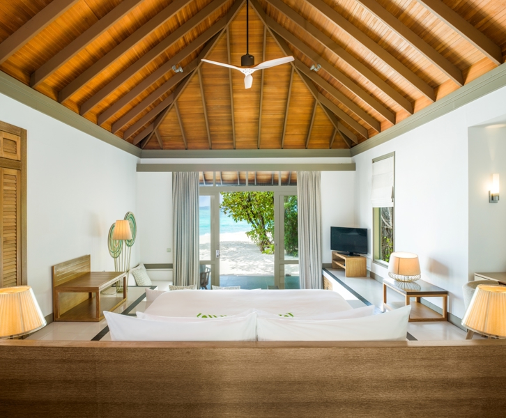 You’ll be staying in a Beach Villa with a Private Pool, giving you direct access to the sand along with plenty of space to unwind. Inside, the design is clean and comfortable, while outside, you have your own pool, sun loungers, and an open-air bathroom that adds to the sense of being outdoors.